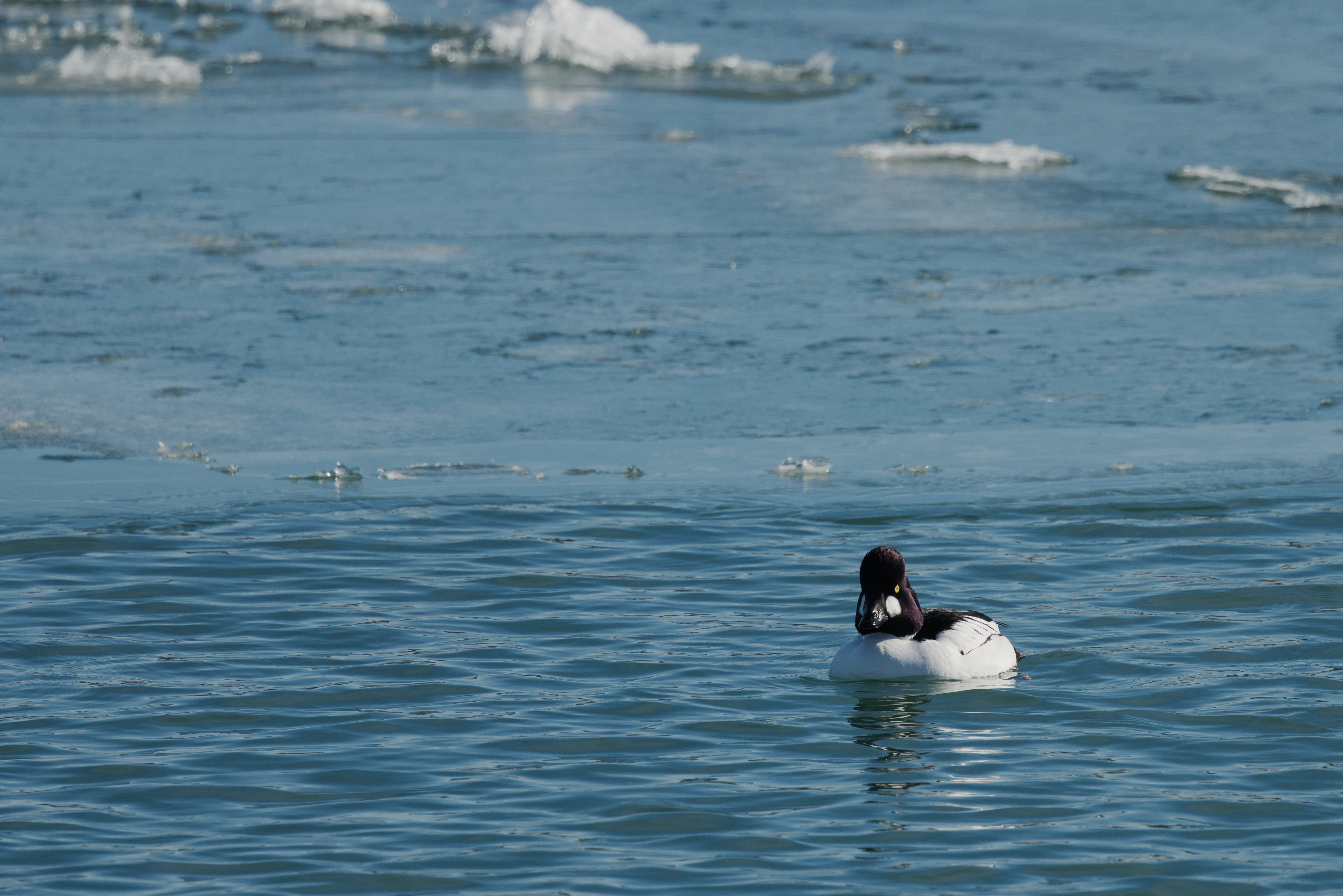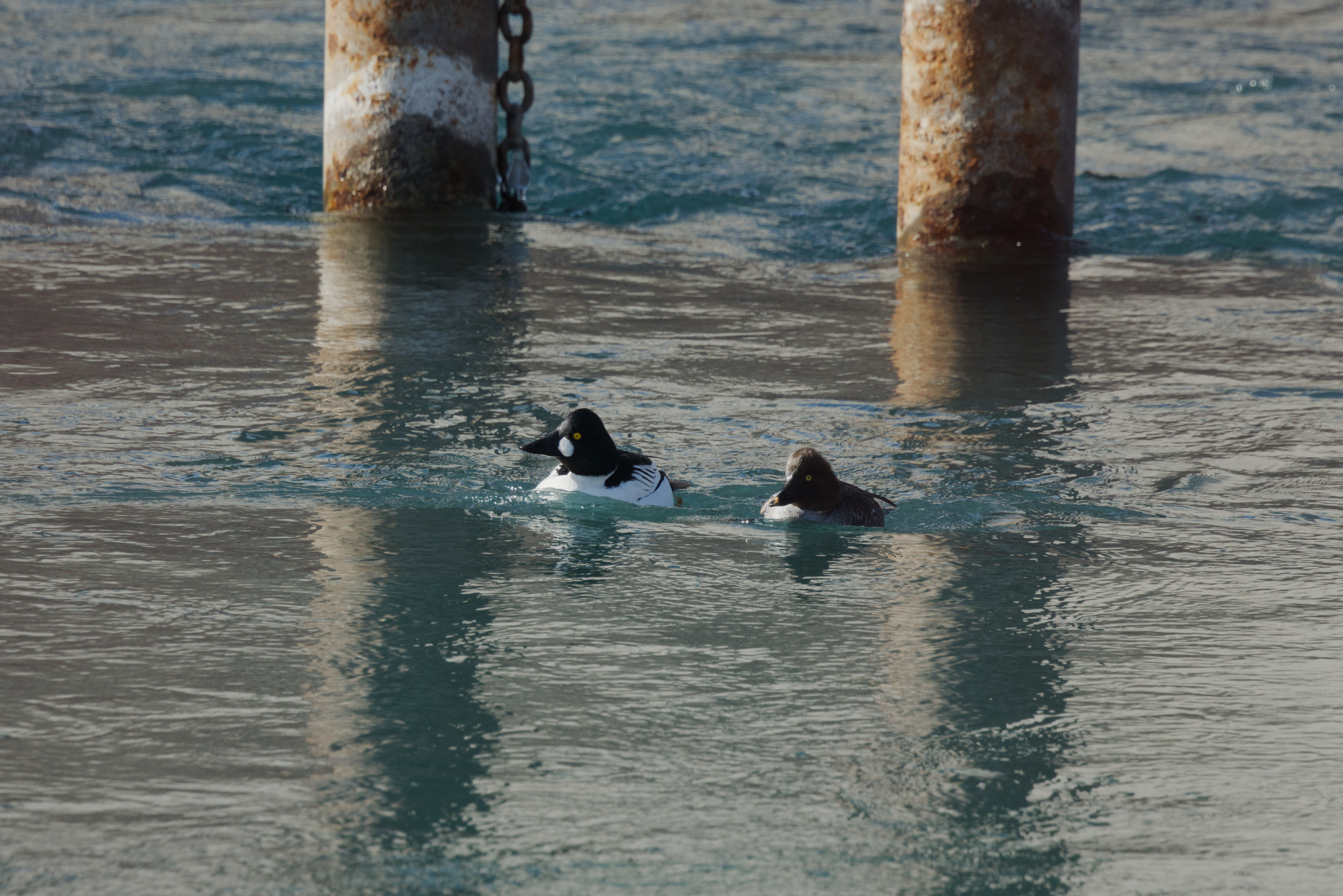 (Eurasian goldeneye) (American goldeneye) The common goldeneye or simply goldeneye (Bucephala clangula) is a medium-sized sea duck of the genus Bucephala, the goldeneyes. Its closest relative is the similar Barrow's goldeneye. The genus name is derived from the Ancient Greek boukephalos ("bullheaded", from bous, "bull" and kephale, "head"), a reference to the bulbous head shape of the bufflehead. The species name is derived from the Latin clangere ("to resound"). Common goldeneyes are aggressive and territorial ducks, and have elaborate courtship displays.