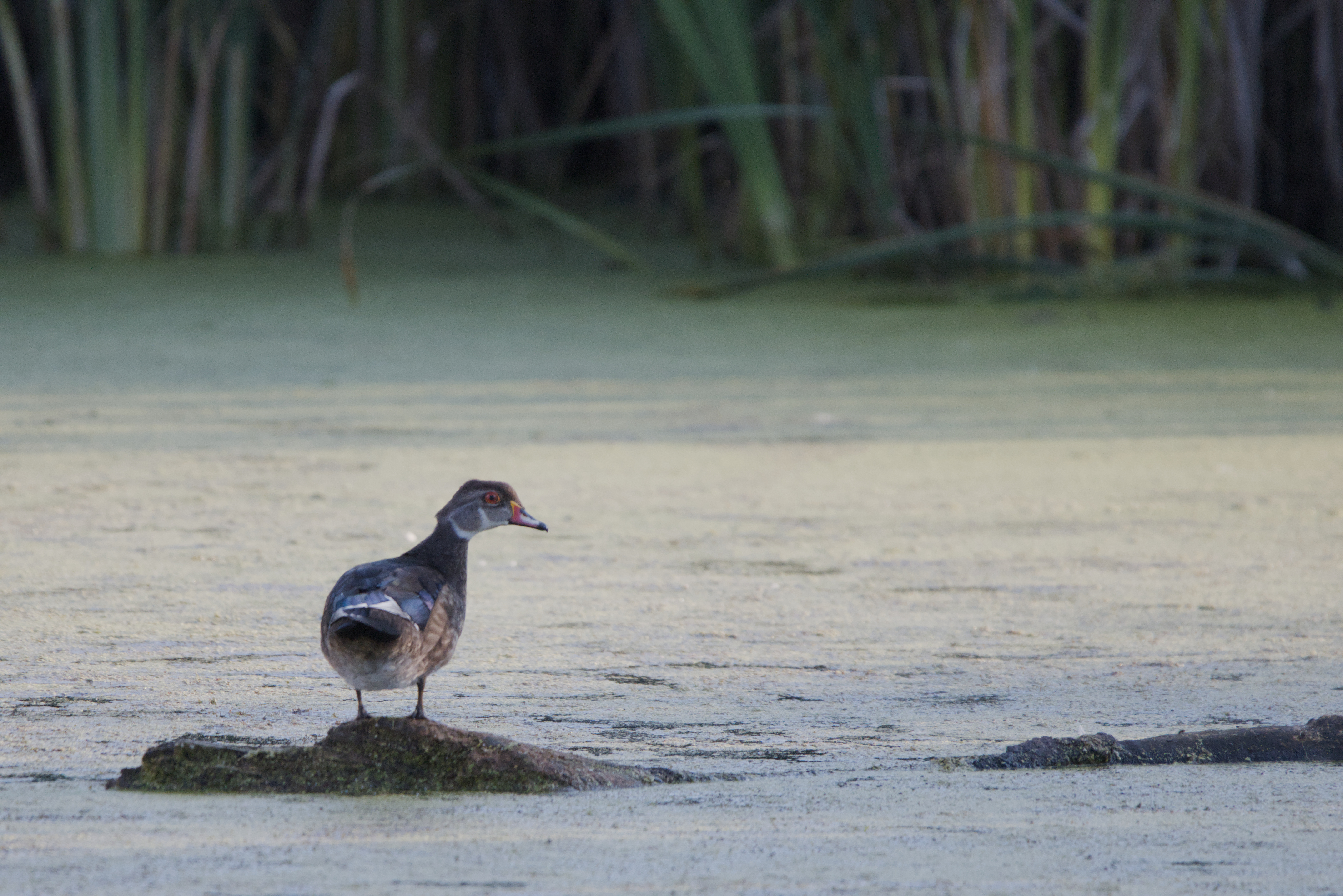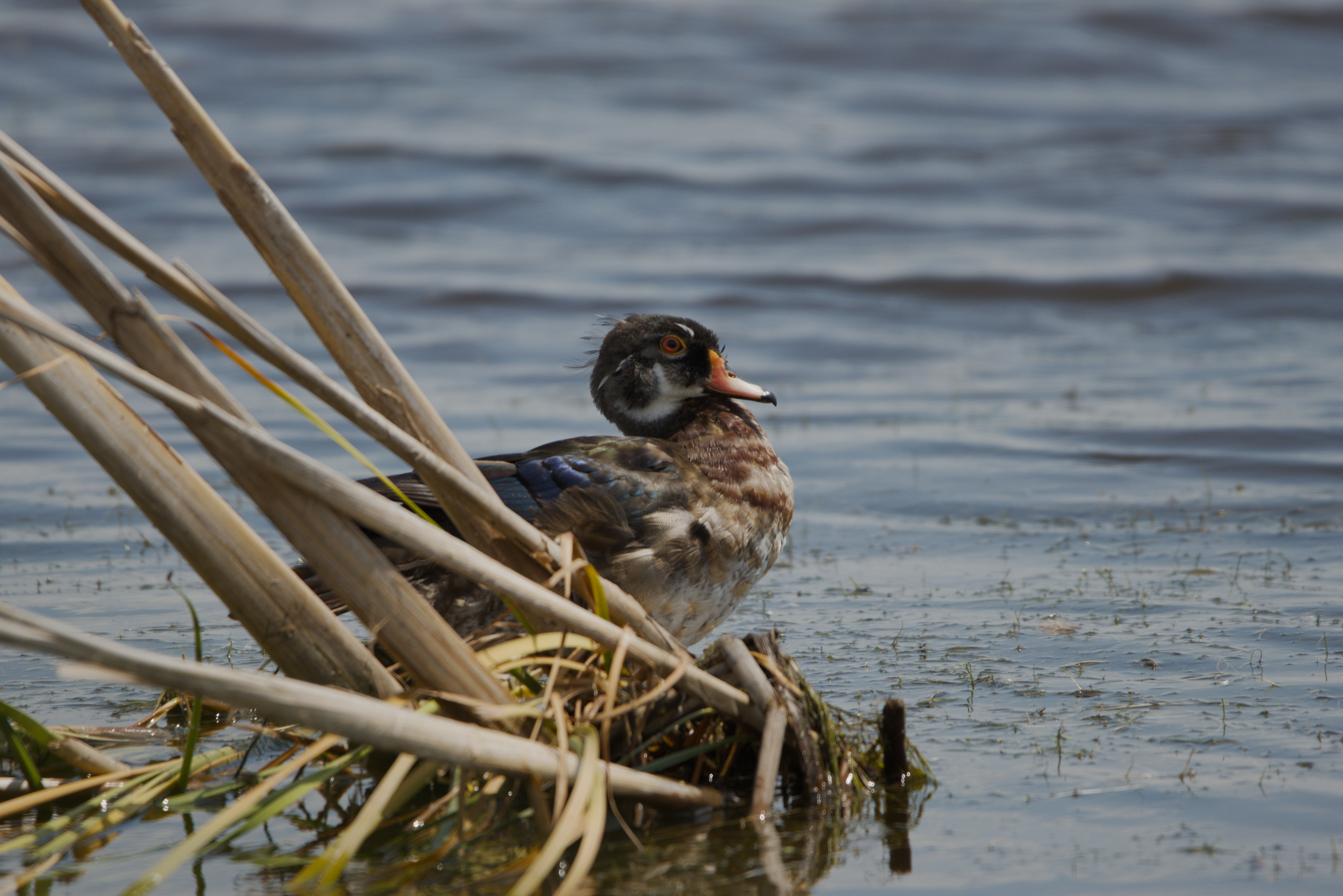 The wood duck or Carolina duck (Aix sponsa) is a partially migratory species of perching duck found in North America. The male is one of the most colorful North American waterfowls.