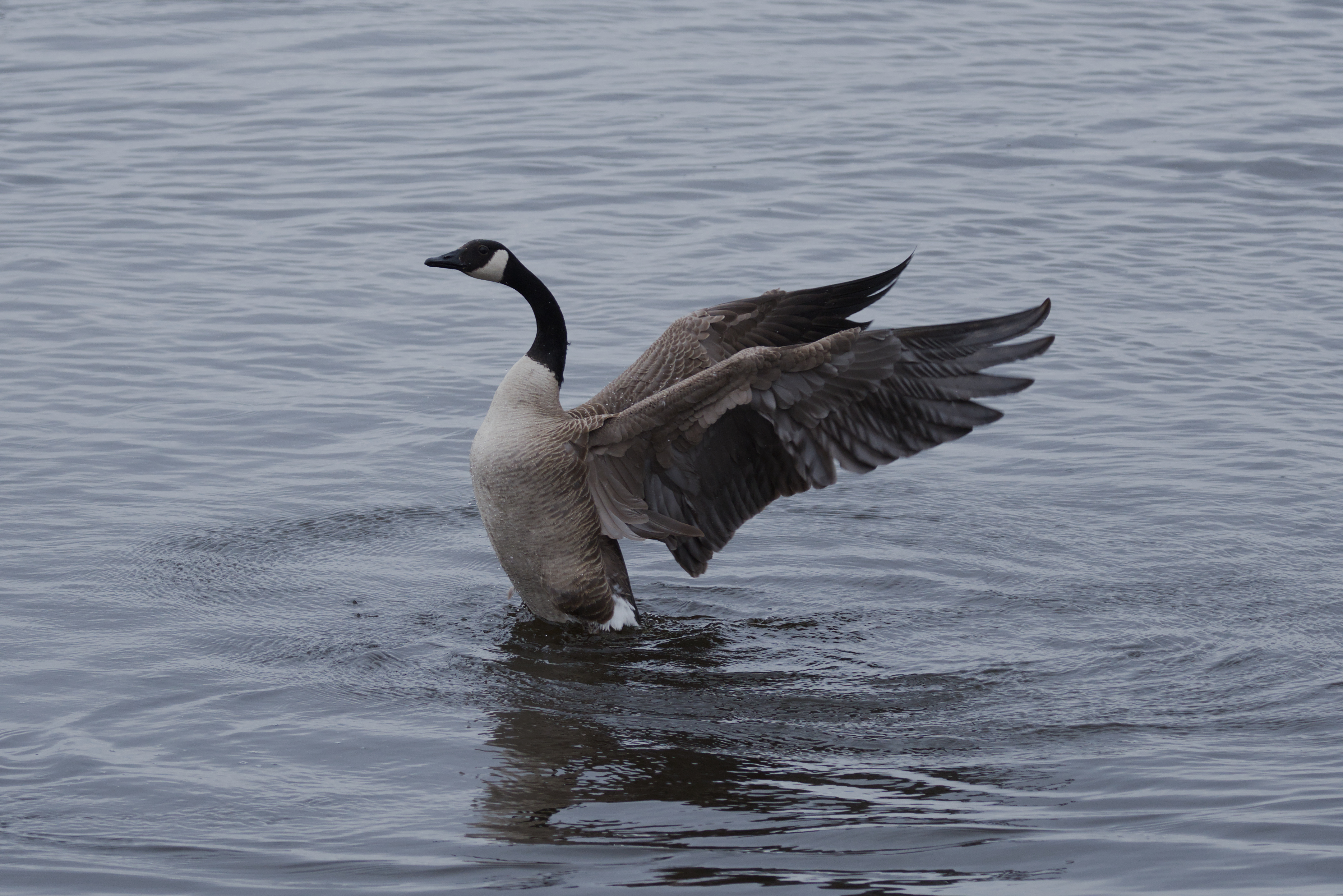 The Canada goose is a large species of goose with a black head and neck, white cheeks, white under its chin, and a brown body. It is native to the arctic and temperate regions of North America, and it is occasionally found during migration across the Atlantic in northern Europe. It has been introduced to France, the United Kingdom, Ireland, Scandinavia, New Zealand, Japan, Chile, Argentina, and the Falkland Islands. Like most geese, the Canada goose is primarily herbivorous and normally migratory; often found on or close to fresh water, the Canada goose is also common in brackish marshes, estuaries, and lagoons.
