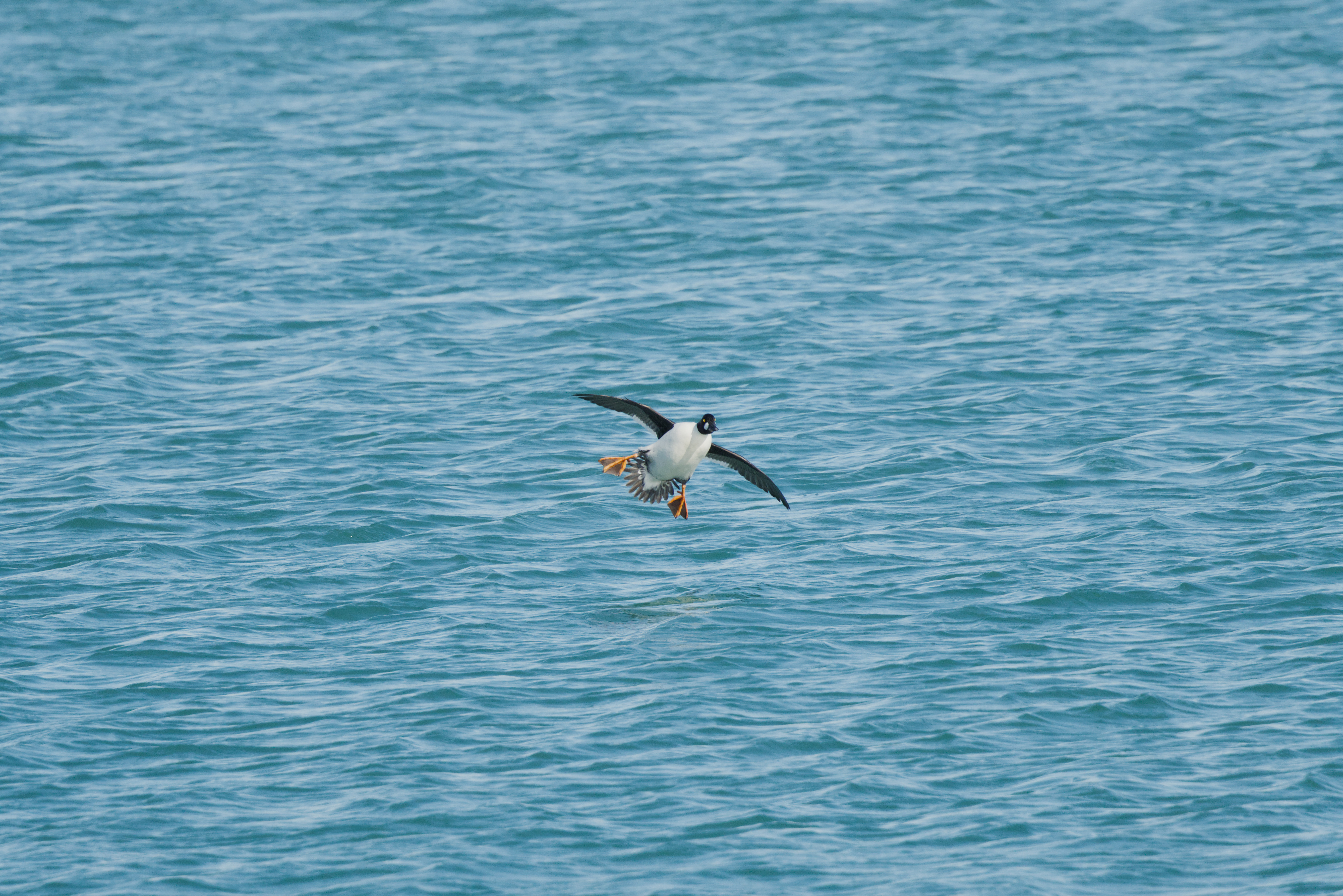 (Eurasian goldeneye) (American goldeneye) The common goldeneye or simply goldeneye (Bucephala clangula) is a medium-sized sea duck of the genus Bucephala, the goldeneyes. Its closest relative is the similar Barrow's goldeneye. The genus name is derived from the Ancient Greek boukephalos ("bullheaded", from bous, "bull" and kephale, "head"), a reference to the bulbous head shape of the bufflehead. The species name is derived from the Latin clangere ("to resound"). Common goldeneyes are aggressive and territorial ducks, and have elaborate courtship displays.