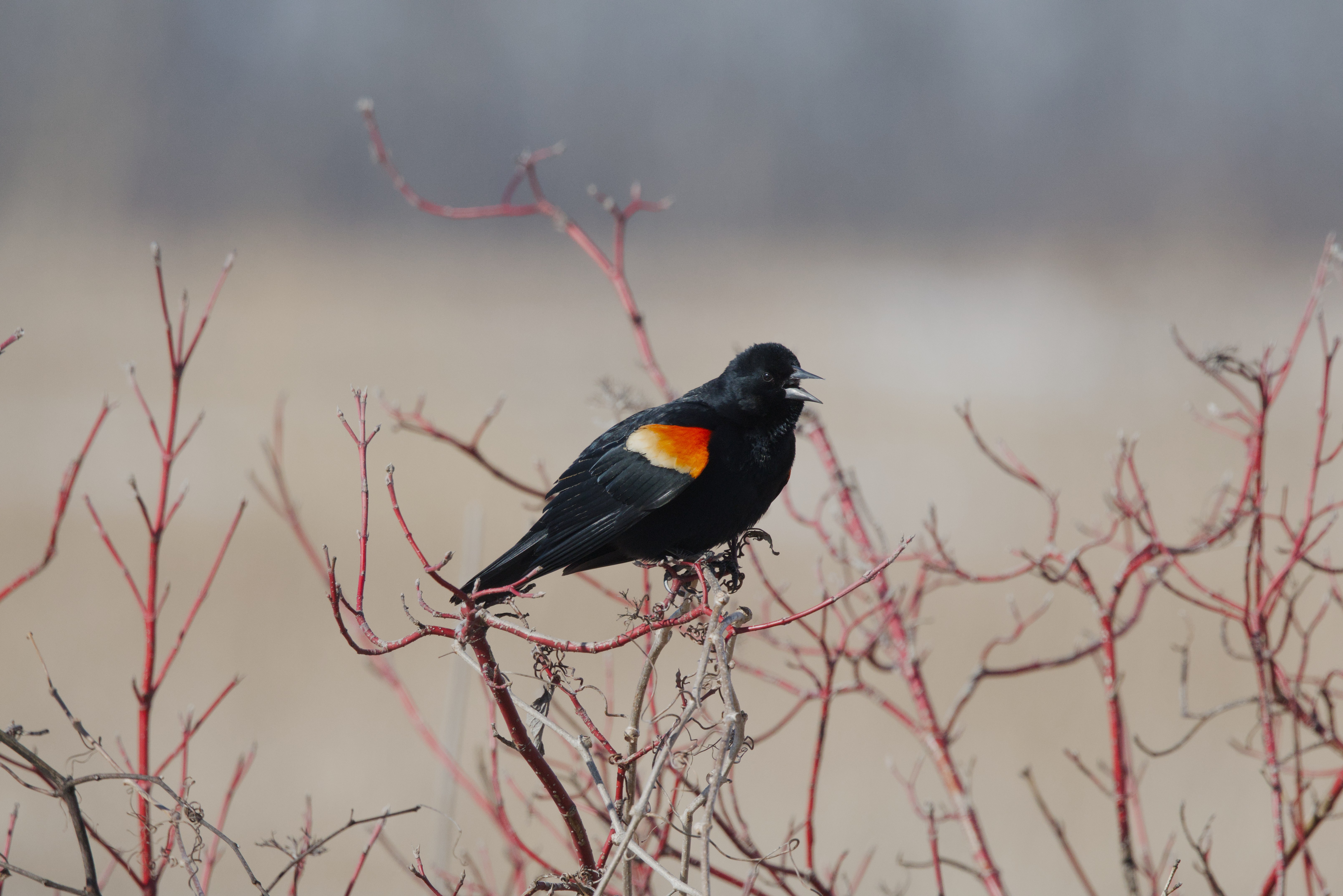 The red-winged blackbird is a passerine bird of the family Icteridae found in most of North America and much of Central America. It breeds from Alaska and Newfoundland south to Florida, the Gulf of Mexico, Mexico, and Guatemala, with isolated populations in western El Salvador, northwestern Honduras, and northwestern Costa Rica. It may winter as far north as Pennsylvania and British Columbia, but northern populations are generally migratory, moving south to Mexico and the Southern United States.